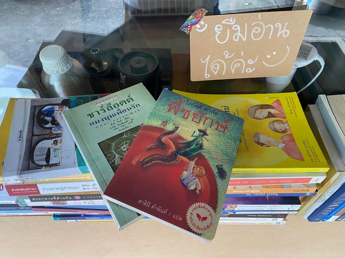 ยืมกลับบ้านไปอ่านได้ ไม่ต้องลงทะเบียน ไม่มีค่าใช้จ่าย ไม่ต้องทำอะไรเลย แค่คุณเลือกหนังสือที่คุณสนใจ พยักหน้าบอกกันนิดนึง หรือถ้าไม่เห็นใคร หยิบไปเลยก็ได้