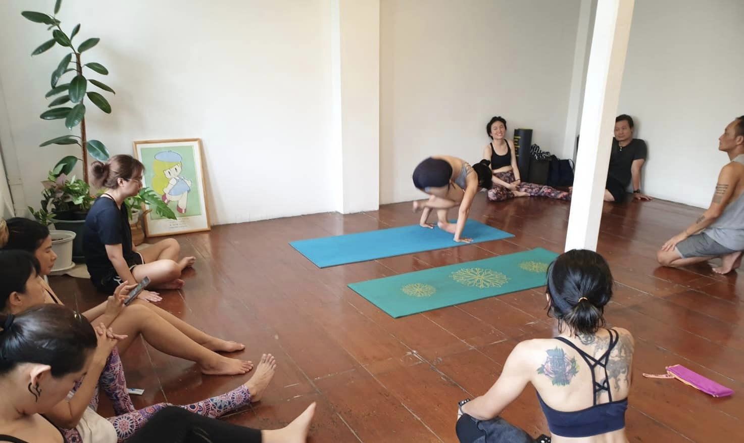 พื้นที่ชั้นสองของP.space โดยปกติเราจะใช้เป็นพื้นที่สอนโยคะอยู่แล้ว และพี่ยาได้มาปิ๊งกับพื้นที่ชั้นสองของเราที่เป็นพื้นไม้ในตึกเก่าแก่ย่านพระนครก็เลยติดต่อเช่าพื้นที่เพื่อจัดคลาสโยคะส่วนตัวเล็กๆขึ้น
