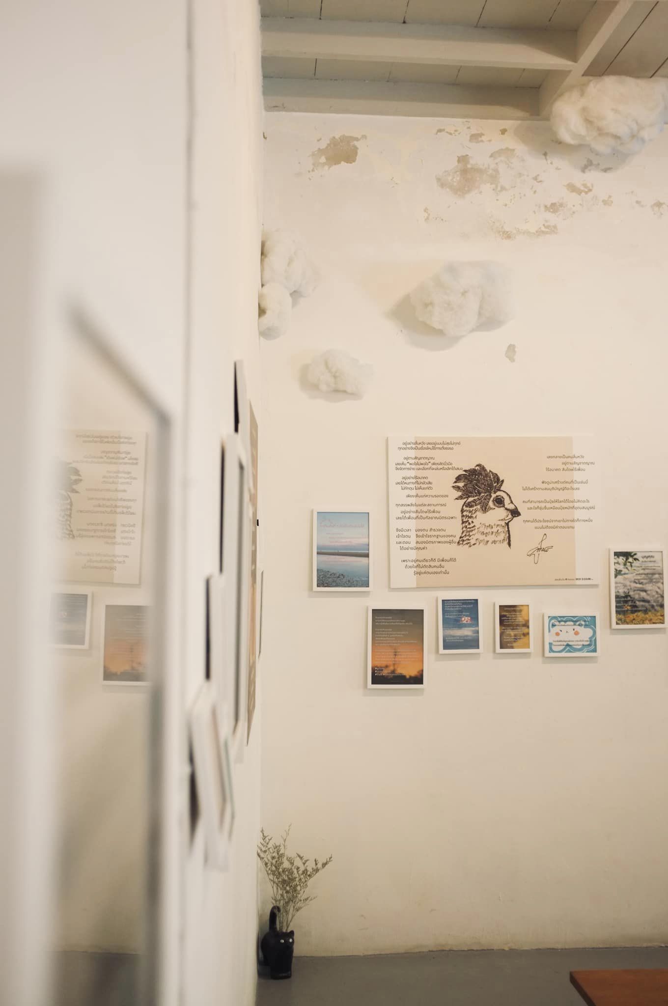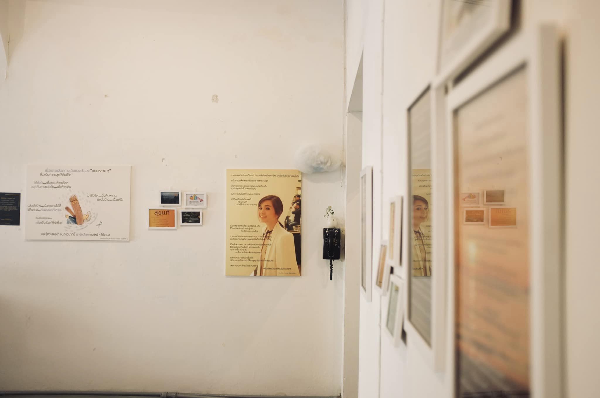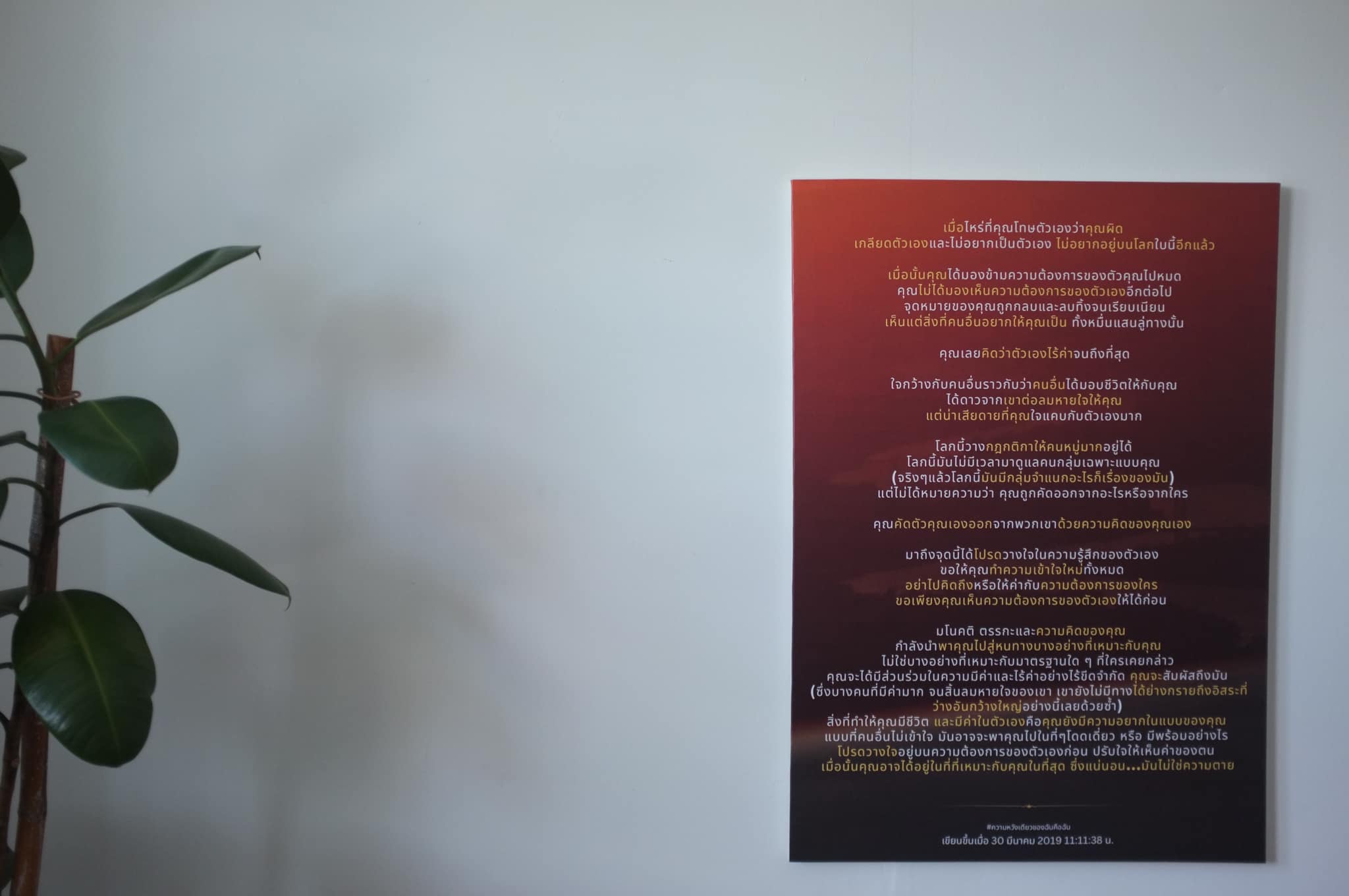 เราค่อนข้างคำนึงถึงระยะการมอง และระดับการอ่าน การอ่านอะไรที่ต้องใช้สมาธิหรือสำรวจใจตนเองมาก ๆ ตามความรู้สึกของผมสายตามันต้องตก ๆ หน่อยไม่มองสูงมาก มันจะค่อนข้างคิดได้ดี จึงแขวนทุกข้อความให้เตี้ยกว่าพวกภาพวาดที่ต้องเสพกันอีกแบบ เพลงเราก็เลือกเพลงที่เราฟังแล้วเราสงบได้ตอนอยู่บ้าน เอามาเปิดในงานด้วย