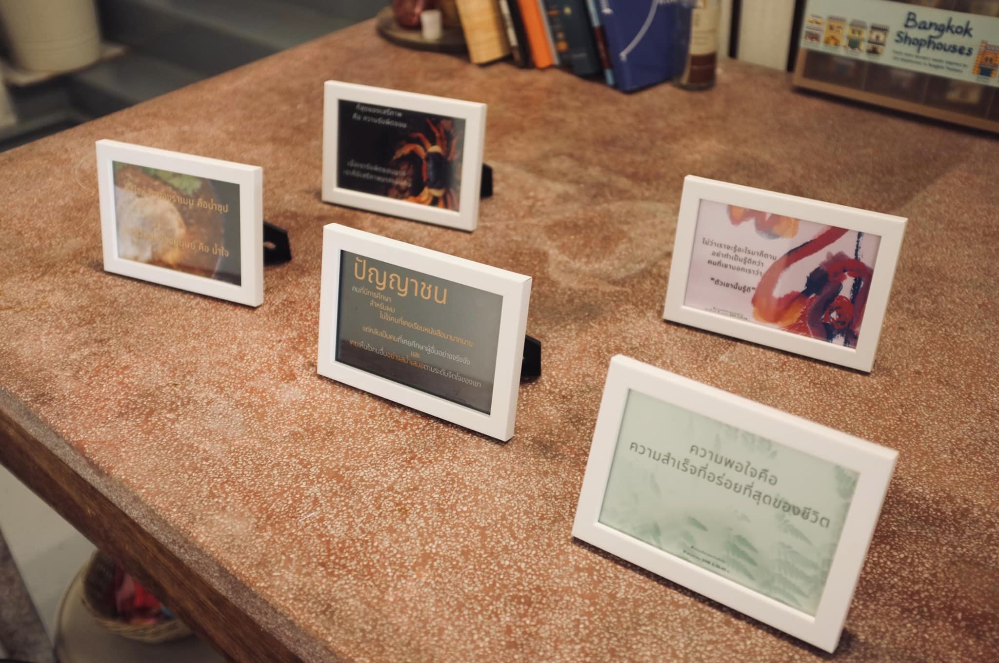ตอบ : ได้เรียนรู้ว่า การจัดนิทรรศการของตัวเอง มันมีความหมายในทางจิตวิญญาณกับเจ้าของงานมากกว่าผู้มาสัมผัสตัวงานเสียอีก ยิ่งเป็นนิทรรศการคำคมข้อเขียน เรายิ่งได้ทบทวนสิ่งที่เราเป็นมาและสำรวจกระแสความคิดมา เราเห็นโครงสร้างของเรา เห็นสัจจะของเราว่ามันทำงานอย่างไร แล้วเห็นว่าเรารักผลงานของเราแค่ไหน สรุปกลายเป็นว่า เรารักความเป็นตัวเองของเรามากขึ้นกว่าเดิม และเราได้เอาใจใส่สิ่งที่กลั่นออกมาจากใจ ให้ส่งไปหาผู้อื่นอย่างละเอียดละออขึ้นไปอีกขั้นนึง