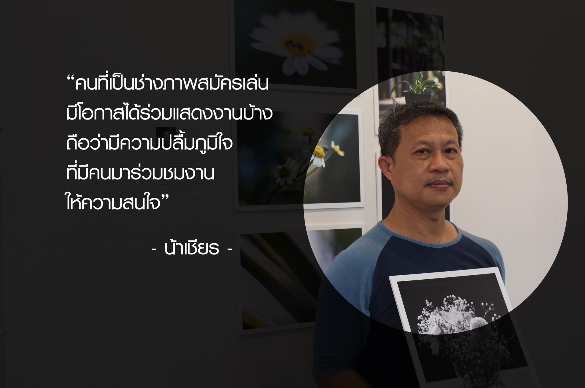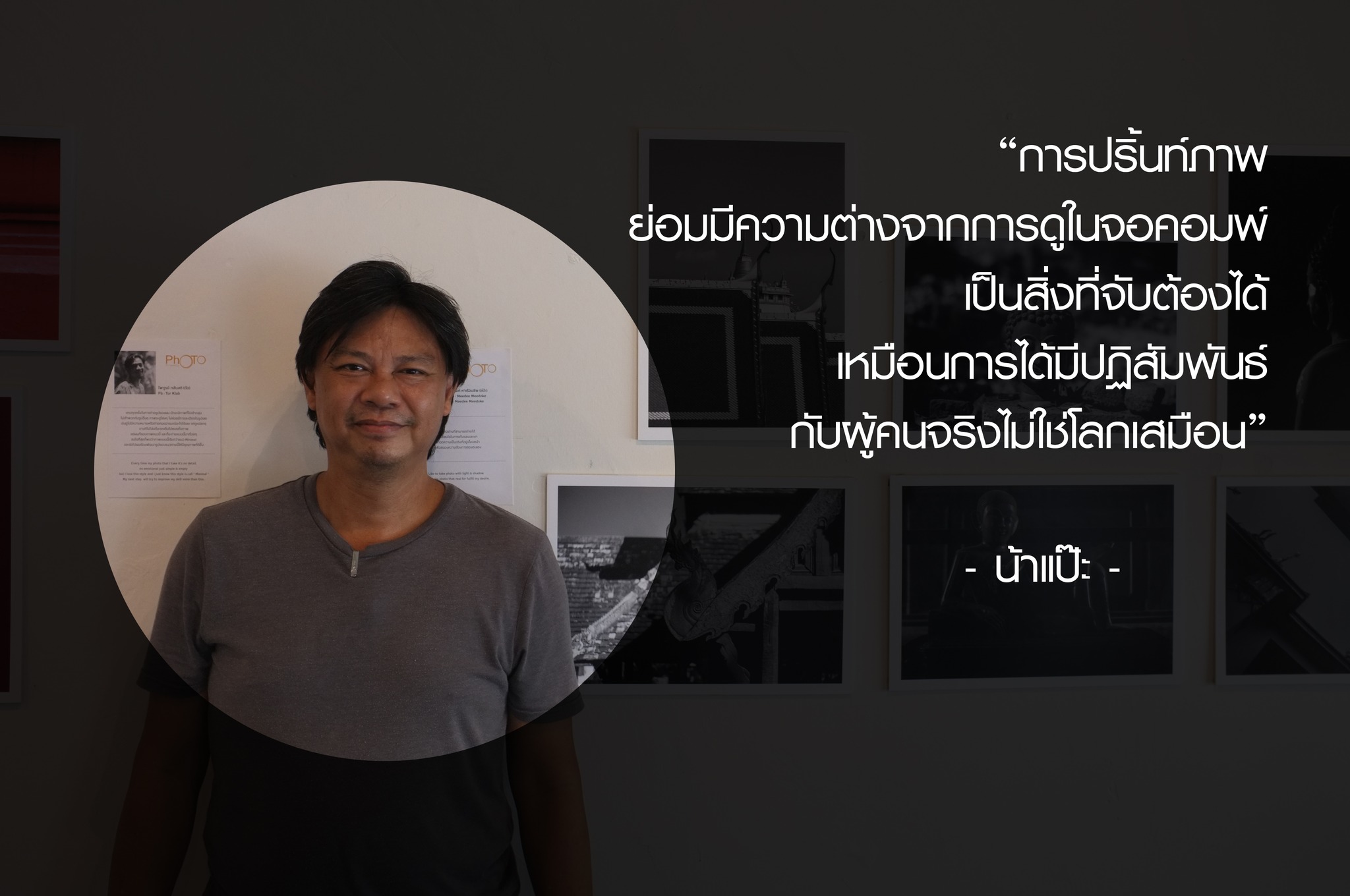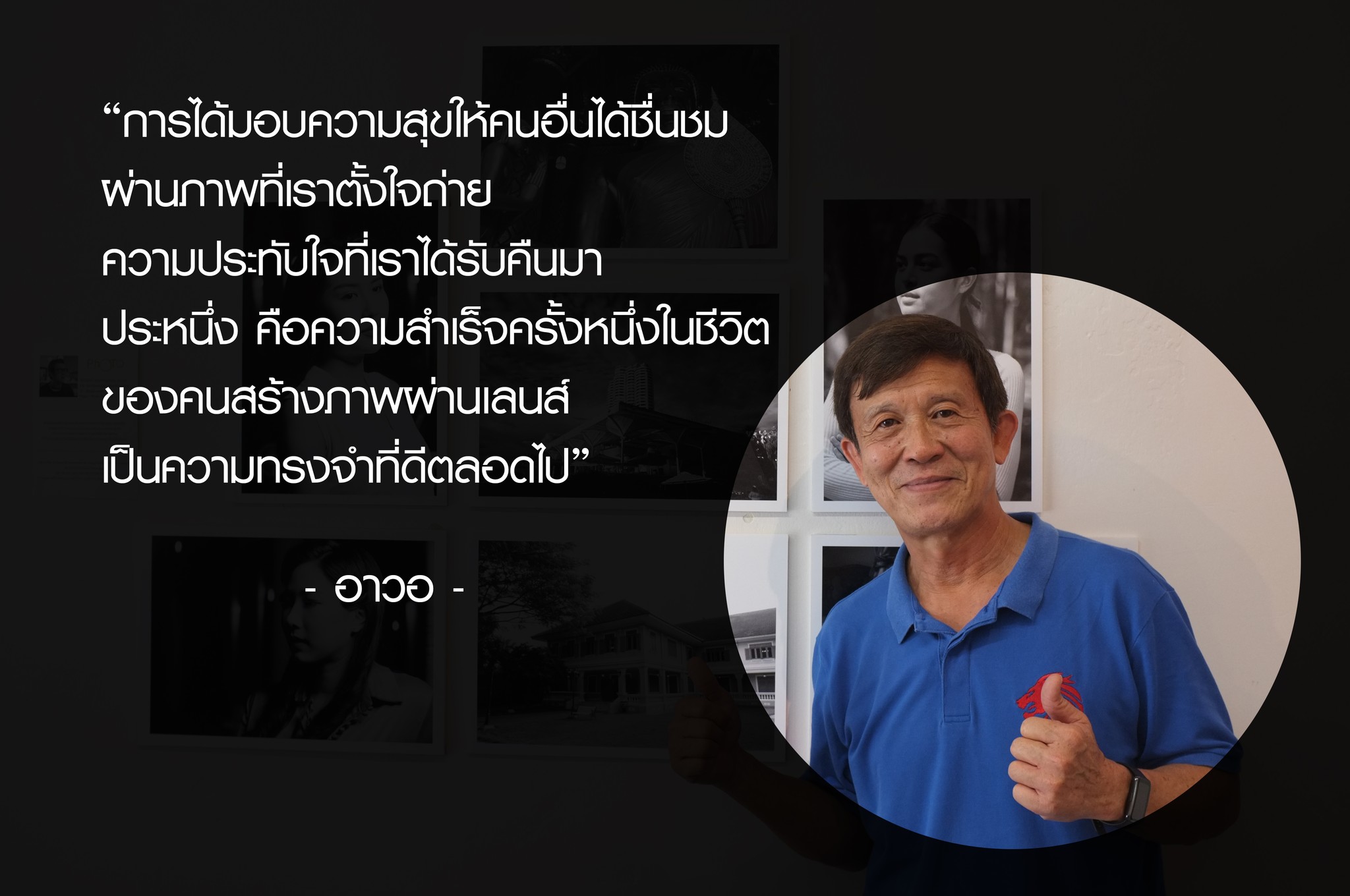 สุดท้าย ขอฝากถึงคนที่รักการถ่ายภาพทุกคน ที่มีความฝันจะจัดแสดงภาพสักครั้งในชีวิต อย่าได้คิดมากว่าผลงานของตัวเองจะไม่คู่ควรในการจัดแสดง เพราะเอกลักษณ์ในการสร้างภาพของแต่ละคนล้วนแตกต่างกันตามจินตนาการ สิ่งสำคัญไม่ใช่ที่ฝีมือหรือมุมมอง หรือการแข่งขันเพื่อชิงชัย แต่คือการได้ทำในสิ่งที่เราชอบ การได้มอบความสุขให้คนอื่นได้ชื่นชม ผ่านภาพที่เราตั้งใจถ่าย ความประทับใจที่เราได้รับคืนมา ประหนึ่ง คือความสำเร็จครั้งหนึ่งในชีวิตของคนสร้างภาพผ่านเลนส์ เป็นความทรงจำที่ดีตลอดไป